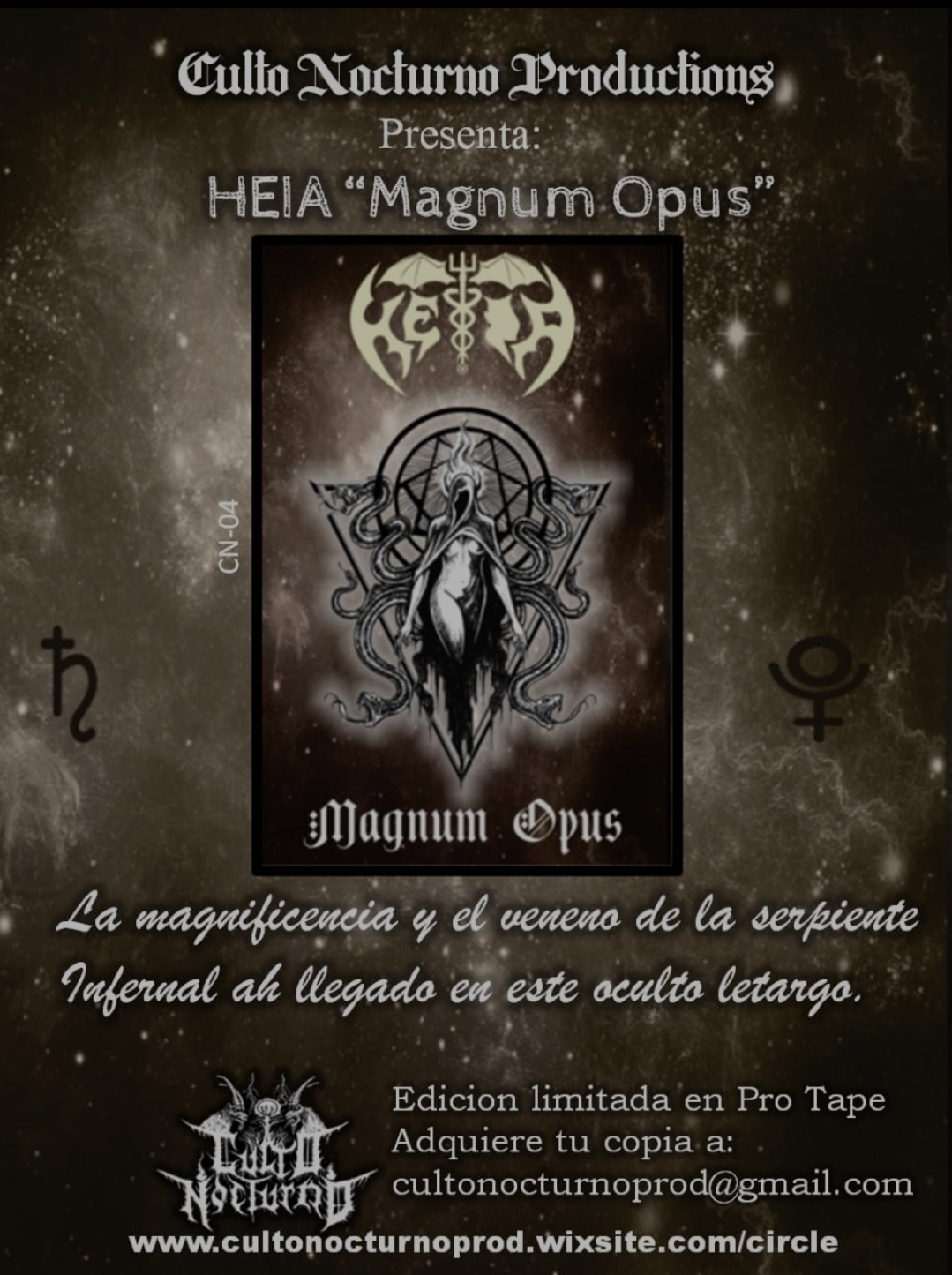 Em outras notícias, a HÉIA anunciou recentemente que seu último full lenght, “Magnum Opus”, ganhou mais um formato de relançamento (limitado em 66 cópias), desta vez em pró-tape pelo selo argentino Culto Nocturno Productions, confira o anuncio: